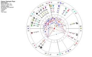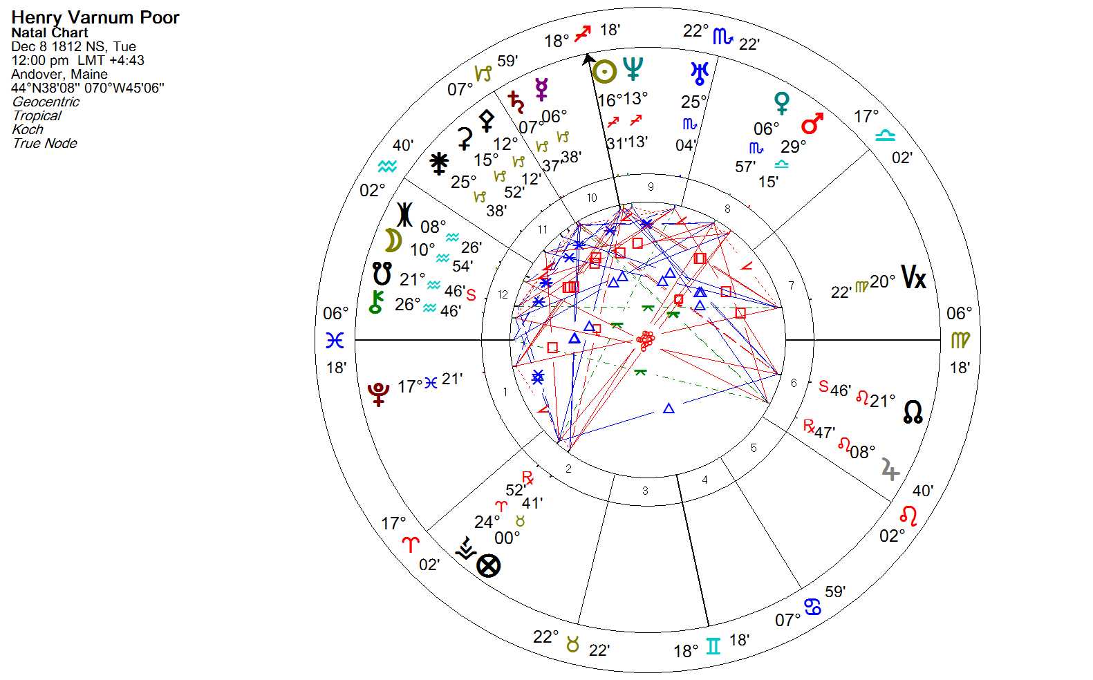 His Sun conjoined to Neptune in cosmopolitan, internationally savvy Sagittarius conjoined to Neptune shows a fiery visionary who can seriously think (Saturn in Capricorn) and evaluate the soundness (Mercury in Capricorn) of the “financial and operational state of U.S. railroad companies.” Henry Poor was a man who could see the future (Sun-Neptune) and translate his intuitive hunches (mutable fire) into a long-lasting (Saturn in its sign of rulership) and respected financial rating institution on classically pin-striped Wall Street.