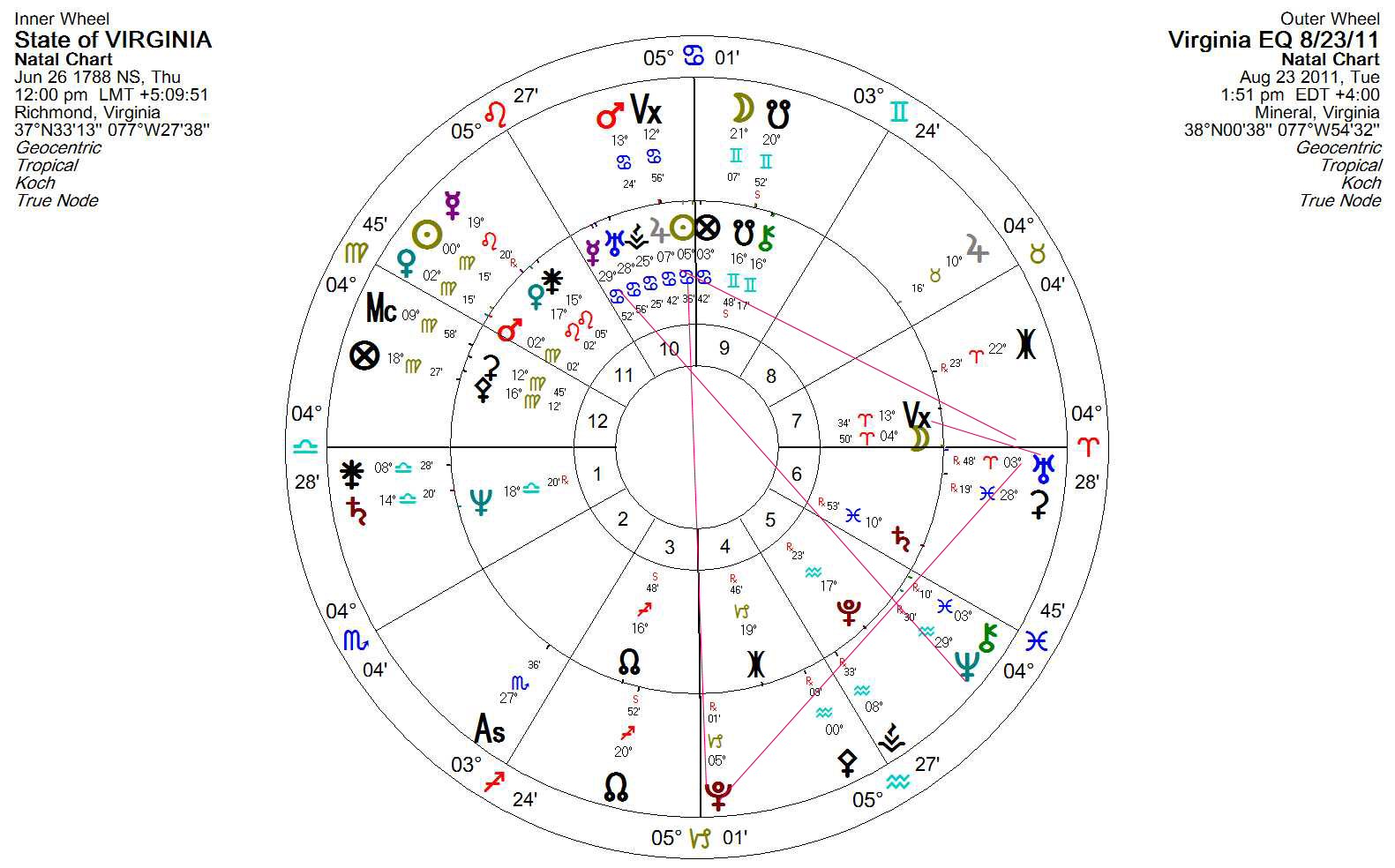 The chart for the State of Virginia is June 26, 1788, at 12:00 pm. The noon time comes from the Virginia Historical Society. Virginia has cardinal angles, which places transiting Saturn in Libra in the first, Uranus in Aries in the 7th and Pluto on the 4th house cusp. Saturn is too far in degree to make a perfect cardinal grand square with Virginia’s Cancerian Sun and Jupiter, but it sure seems to be working that way. T-Pluto on the I.C. cusp opposite Virginia’s Sun is certainly the “up from under” thrust set off by unexpected shakes Uranus in the 7th house.