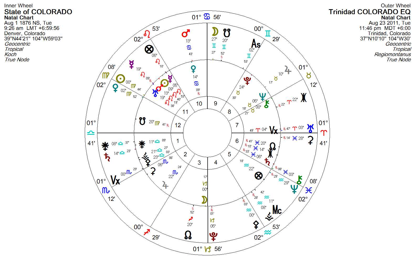 Colorado’s horoscope (August 1, 1876, 9:26 AM, LMT, 01 Libra Asc) and the chart for the EQ event in Trinidad is quite nearly Virginia’s EQ Redux. Mars conjoins Colorado’s 10th house Venus in Cancer and squares transiting Saturn in Libra. Note: cardinal signs signal events on the world stage. We’ve got a highly volatile mix with Uranus in Aries square Pluto in Capricorn. Both planets are retrograde and the first of the perfect squares doesn’t take place until June 2012, but when you see something work, you’ve got to make note of it.