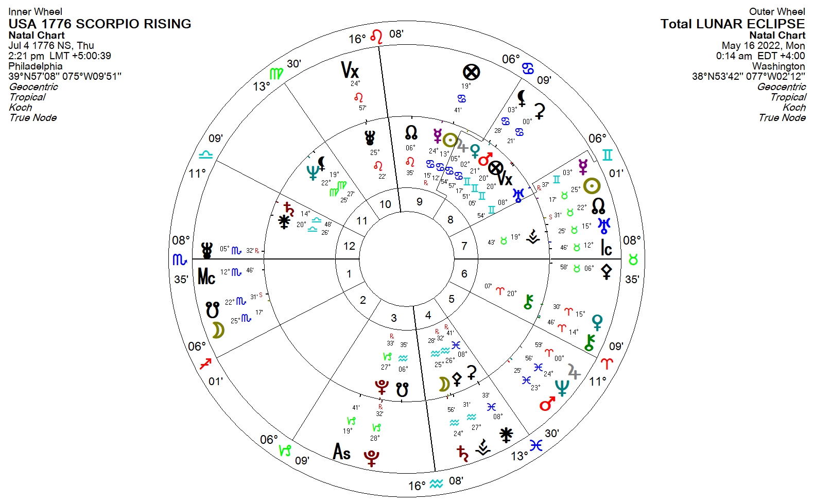 The USA’s Moon [horoscope ruler of “we the people”] is “squared [90-degree aspect]” by friction, obstacles and struggle courtesy of the Eclipse Sun and Moon in the signs Taurus & Scorpio.